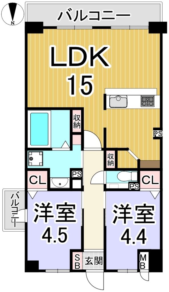 専有面積58.86㎡(17.80坪)バルコニー南、東向き:7.97㎡