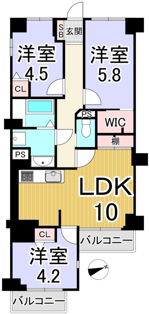 | 専有面積 | 61.59㎡(18.63坪) | バルコニー | 南東向き5.75㎡ |
